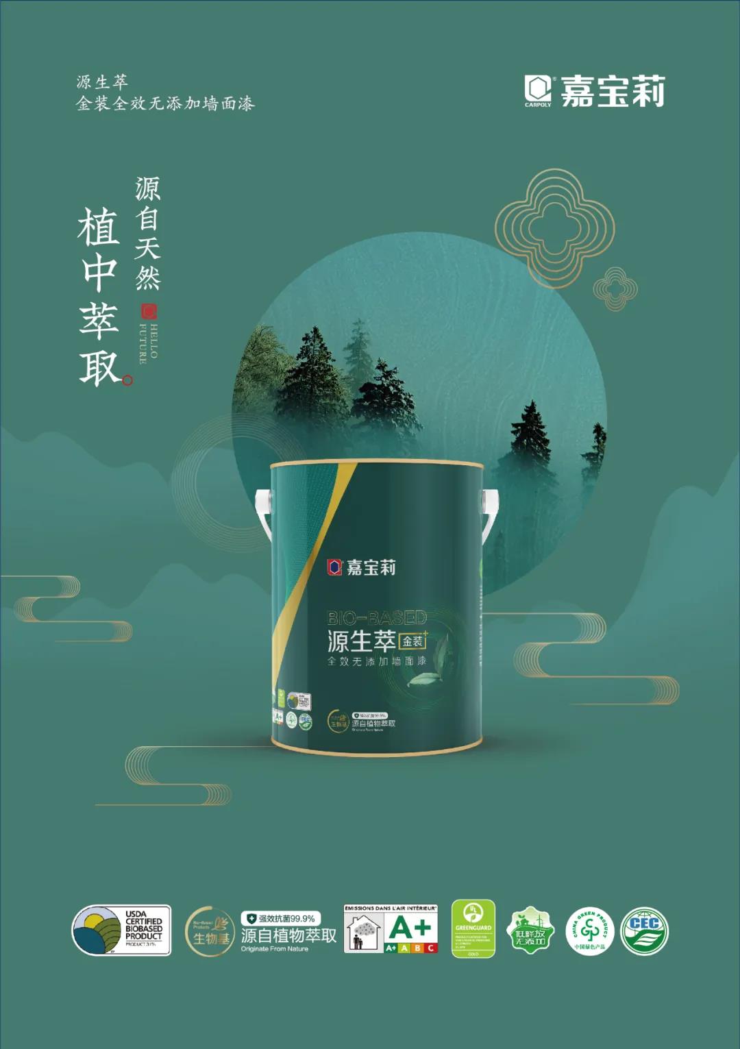 源生萃金装全效墙面漆,萃取天然植物精华,采用可再生资源生物基原料和先进的技术工艺生产,有美国USDA生物基认证、美国GREENGUARD绿色卫士金级双认证、法国室内空气环境A+检测认证、而且满足低释放标准室内空气A+标准,还符合EN71-3欧盟玩具安全标准,更有I 级抗菌、强效防霉,有效抗菌率达99.9%,营造自然清新,环保健康的家居环境。