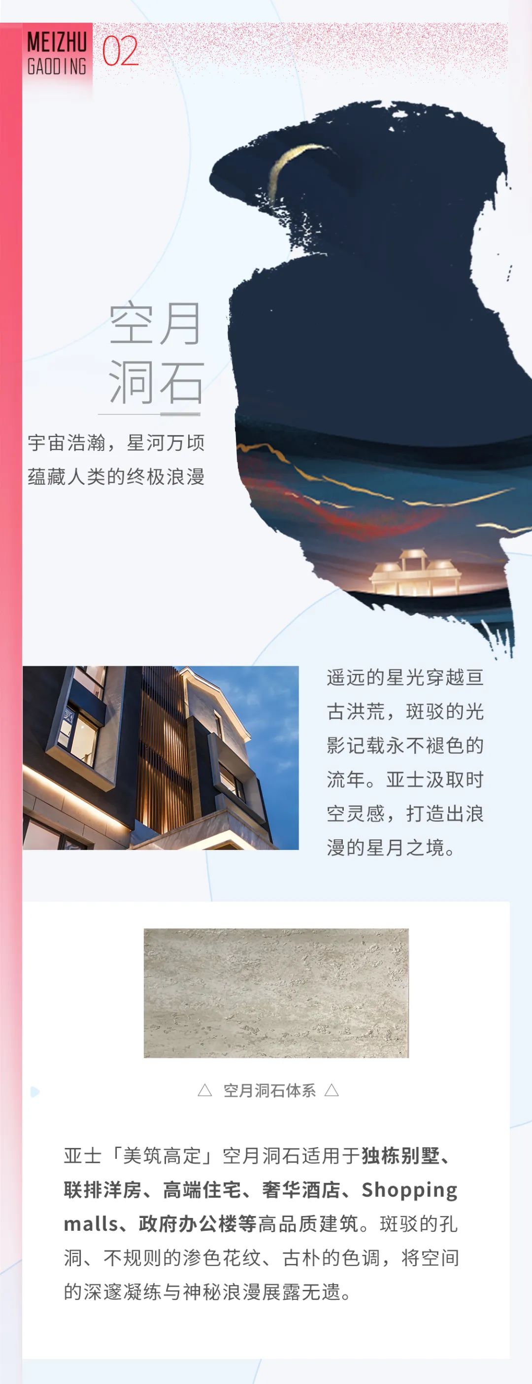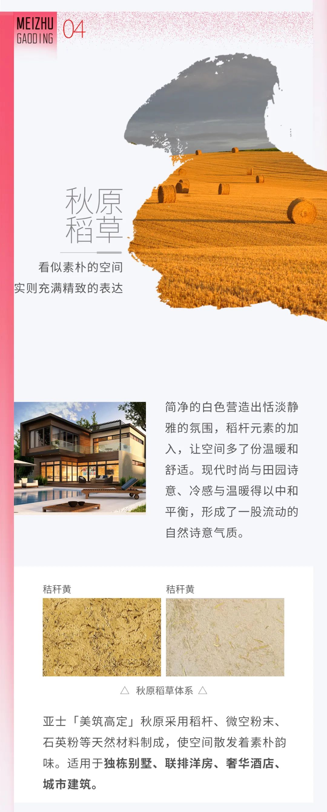 亚士「美筑高定」系列将自然灵气融入到当代的建筑空间和生活品位中,拉近建筑与自然、人的距离,诠释出人对于美好生活的向往与追求。它以高档的装饰效果以及高雅的艺术气息成就人们的诗意栖居,是高档涂装的不二之选。