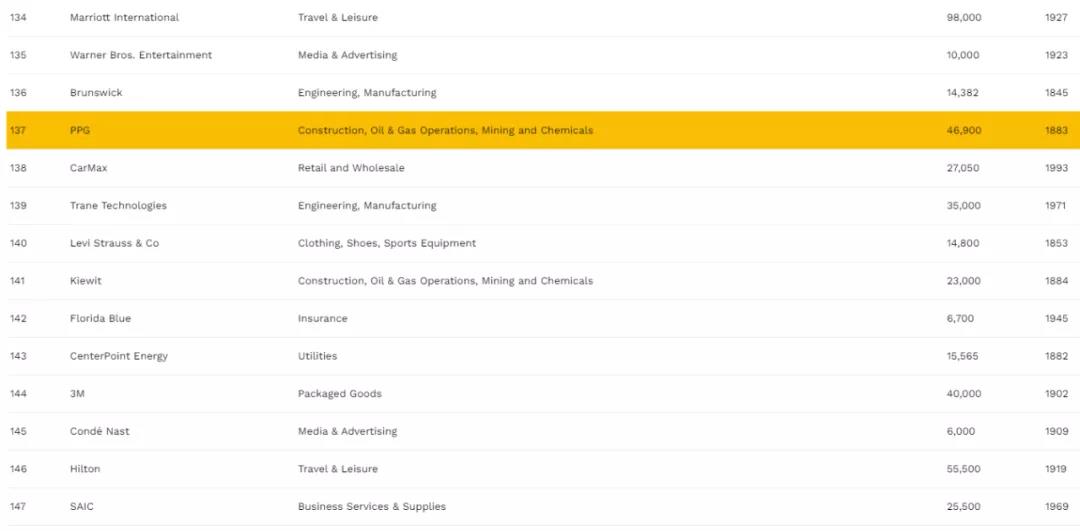 《福布斯》“2021年最佳女性雇主”榜单截图,PPG位列第137位