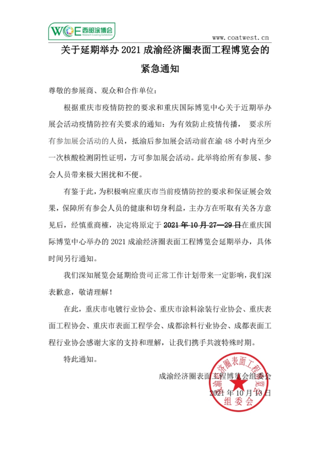 有鉴于此,为积极响应重庆市当前疫情防控的要求和保证展会效果,保障所有参会人员的健康和切身利益,主办方在听取有关各方意见后,经慎重商榷,决定将原定于2021年10月27—29日在重庆国际博览中心举办的2021成渝经济圈表面工程博览会延期举办,具体时间另行通知。