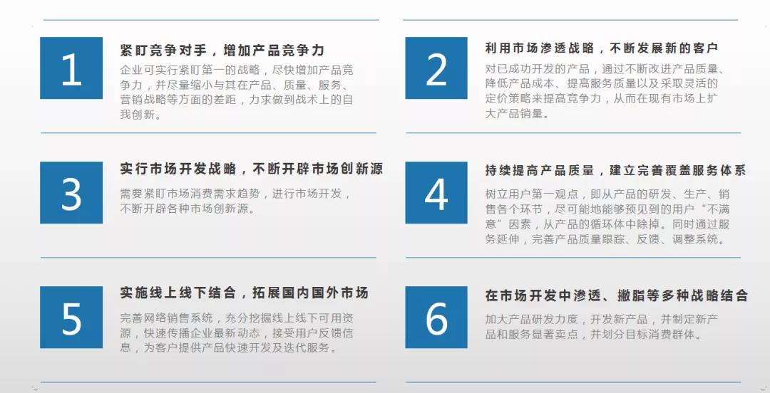 具体在手段和策略上,则是:紧盯竞争对手,增加产品竞争力;利用市场渗透战略,不断发展新的客户;实行市场开发战略,不断开辟各种市场创新源;持续提高产品质量,建立完善覆盖范围的服务体系;实施线上线下结合,深度拓展国内国外市场;在市场开发中将渗透、撇脂等多种战略结合。