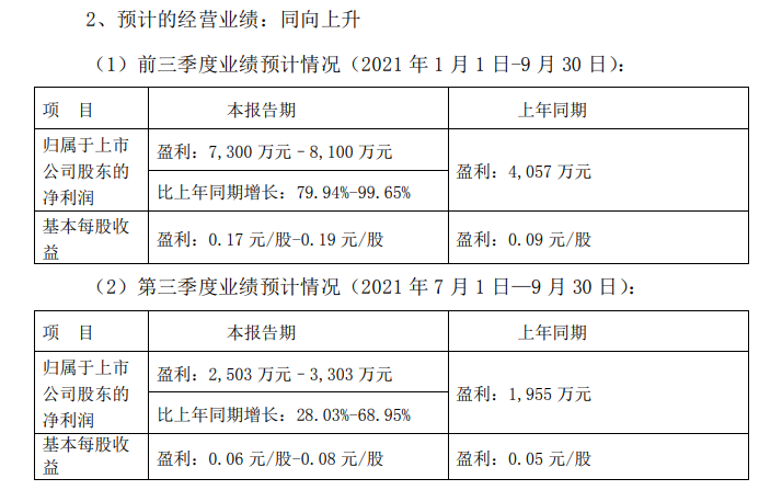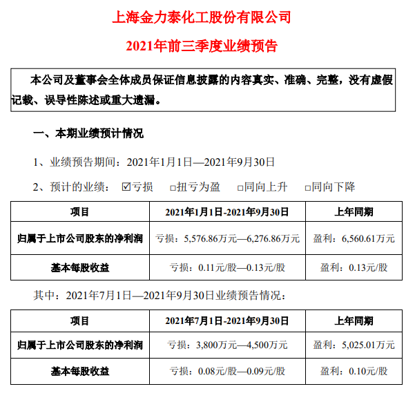 上海金力泰化工股份有限公司2021年前三季度业绩预告(截图)