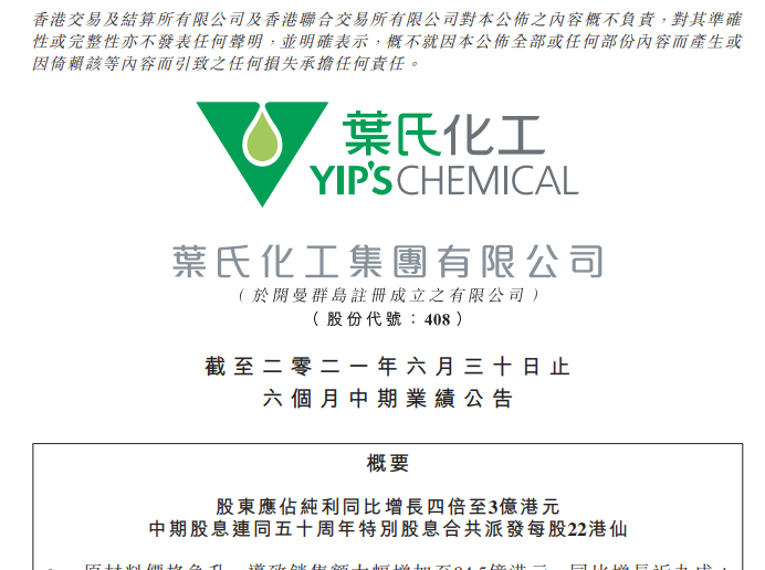 8月19日,叶氏化工集团有限公司(00408.hk,以下简称“叶氏化工”)发布《截至二零二一年六月三十日止六个月中期业绩公告》。