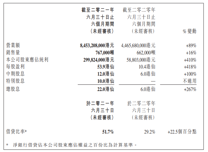 “另一方面,向股东们呈报回顾期内,集团整体信贷状态保持良好。惟因原材料价格急升的缘故,集团各种产品的售价均有不同幅度的提升,以及珠海溶剂新厂在建,期内耗资约1.4亿港元,直接对借贷比率构成影响。于2021年6月30日录得51.7%,比去年同期增加22.5个百分点。”