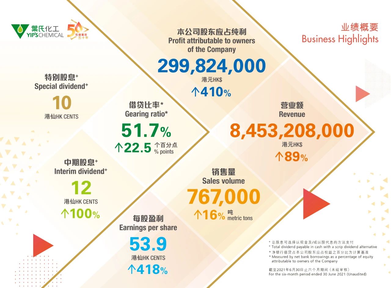叶志成对叶氏化工上半年业绩做出了全面回顾,他表示:“期内集团销售额录得84.5亿港元,同比增长近九成。销售量则录得76.7万吨,同比增长16%。在本公司股东应占纯利方面,回顾期内录得约3亿港元,比去年同期大增410%。”
