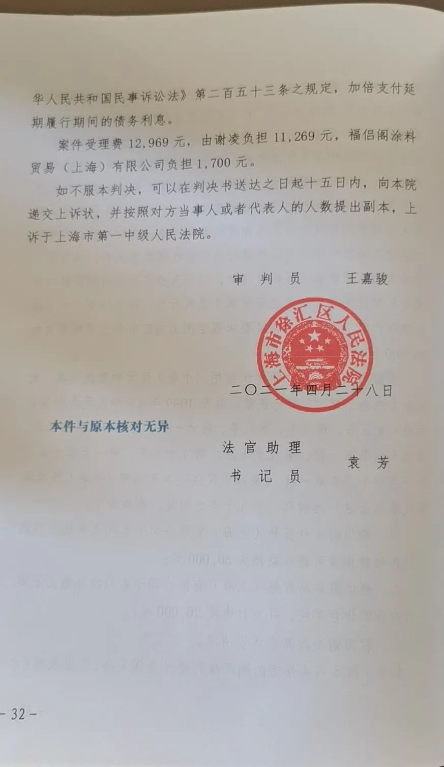 谢凌提供的信息显示,2021年4月28日,上海市徐汇区人民法院对该买卖合同纠纷案件作出一审裁决,判决谢凌胜诉(部分支持),福侣阁公司需向其支付违约金7.6万元。福侣阁公司不服一审判决提起上诉,并于2021年9月15日二审第一次开庭。然而此次开庭之后,谢凌告诉《涂料经》记者,福侣阁“被(二审法院)劝退了,维持原判”。