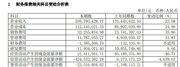 此外,报告期内,东来技术营业成本为1.12亿元,比去年同期增长24.96%,主要系收入增长及化工原材料涨价影响所致;销售费用0.32亿元,比去年同期增长35.86%,主要系公司销售费用随营业收入增长而增加,与营业收入增速相符;管理费用0.12亿元,比去年同期增长31.87%,主要系上期受疫情影响费用减少所致;经营活动产生的现金流量净额较上年同期减少46.71%,主要系公司应对预期原料涨价风险,加大了存货储备力度,导致本期采购支出较往年大幅增加。