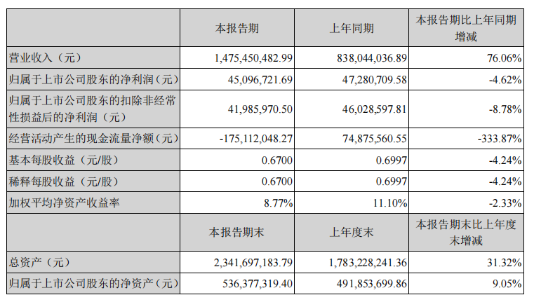 据公告显示:2021年上半年保立佳营业收入14.75亿元,比上年同期8.38亿元增长76.06%;归属于上市公司股东的净利润4510万元,比上年同期4728万元减少4.62%。归属于上市公司股东的扣除非经常性损益后的净利润4199万元,比去年同期4603万元减少8.78%;经营活动产生的现金流量净额为1.75亿元,同比减少333.87%;基本每股收益0.67元,同比下降4.24%。