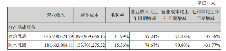其中,建筑乳液的营业收入为10.16亿,比上年同比增长57.24%;毛利率为11.99%,比上年同期减少37.56%。防水乳液营业收入为1.82亿元,比上年同期增长74.67%;毛利率15.36,比去年同期减少31.77%。