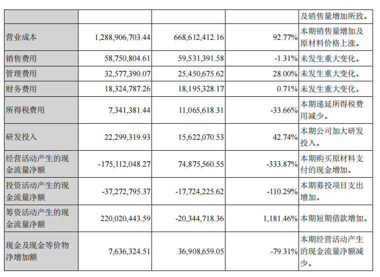 根据财报推断,上半年保立佳净利减少以及产品毛利率的减少是营业成本增加所致。财报显示:2021年上半年保立佳营业成本12.89亿,同比增长92.77%,系“本期销售量增加及原材料价格上涨”所致;经营活动产生的现金流量净额同比减少-333.87%,系“本期购买原材料支付的现金增加”所致。与此同时,公司还加大了研发投入,投入金额2230万元,有来自于计入当期损益的政府补助(研发费用补贴及税收扶持奖励)376.15万元。