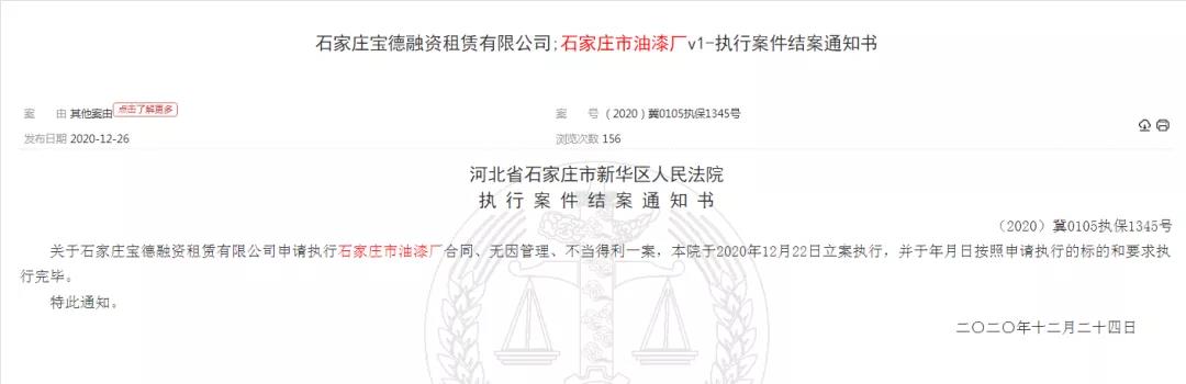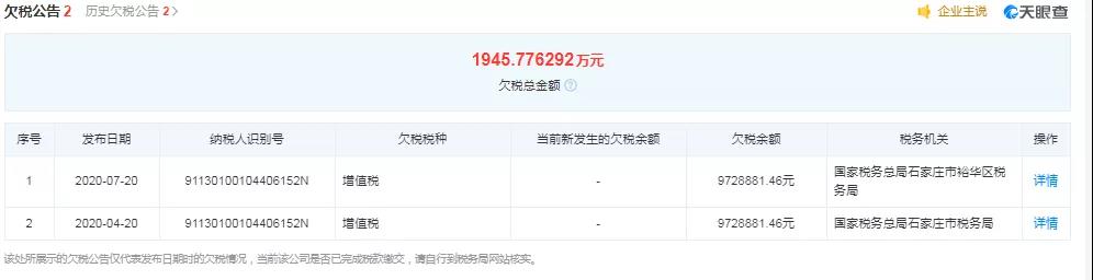 从天眼查所获取的资料也侧面印证了上述观点——石家庄油漆厂于去年4月20日、7月20日分别欠国家税务总局石家庄市税务局、国家税务总局石家庄市裕华区税务局增值税共1945.776292万元。