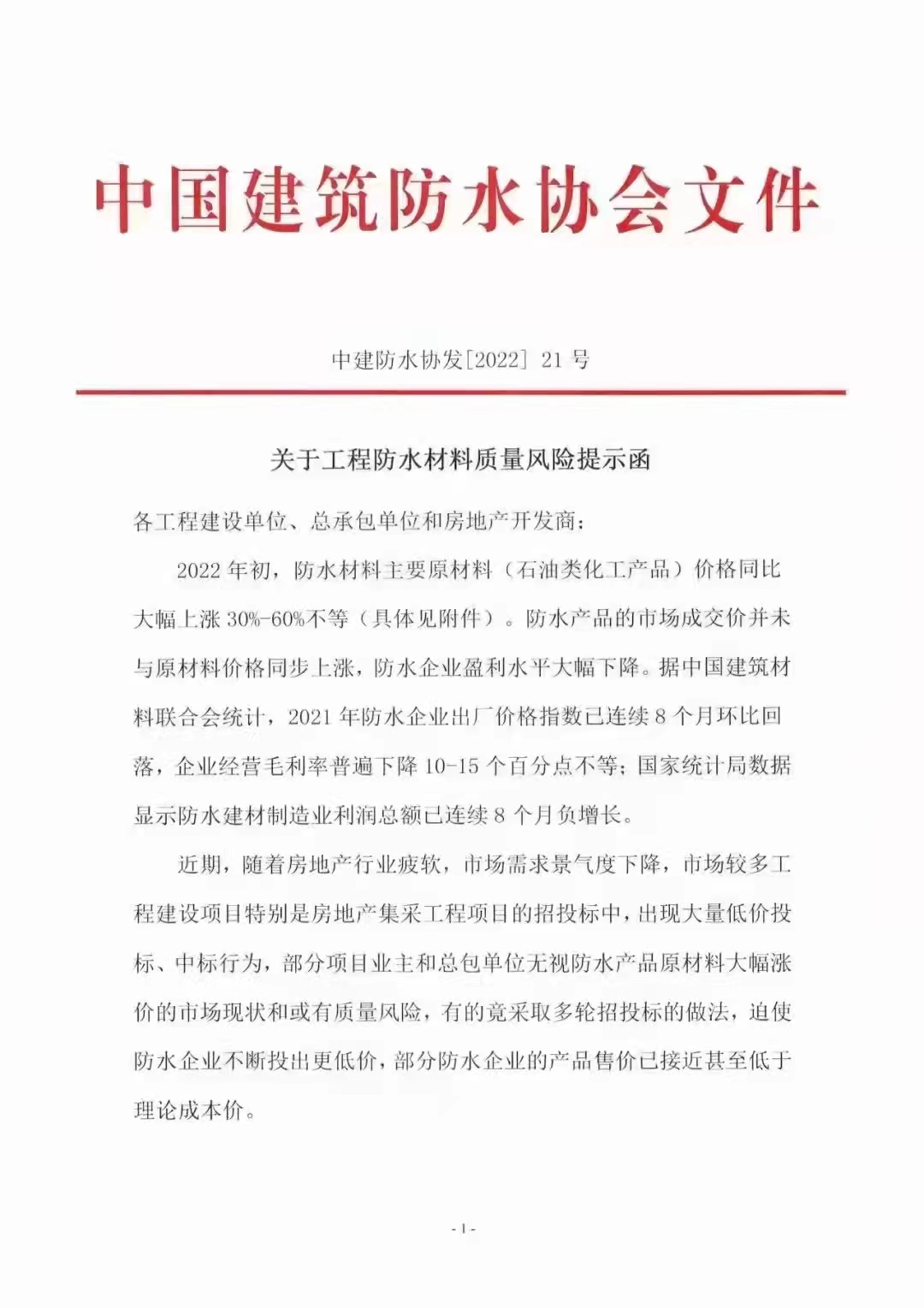 3月2日,中国建筑防水协会发布《关于工程防水材料质量风险提示函》,内容如下: