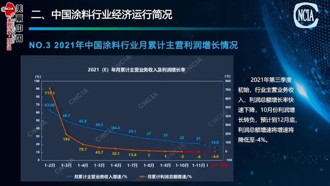 中国涂料工业协会代秘书长刘杰表示,2016-2021年我国涂料行业产量和主营业收入增长趋势基本同步,利润增长则相反,充分反映出涂料行业受上游原材料涨价、下游需求紧缩、行业内卷三方面影响形势日益严重,亏损情况明显。特别是2021年第三季度初始,行业主营业务收入、利润总额增长率快速下降,10月份利润增长转负,预计到12月底,利润总额增速将降低至-4%。