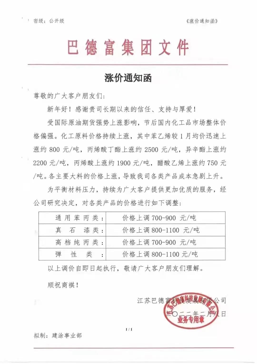 另外,2月9日,巴德士也发布了涨价预警函,称国际原油持续上涨,化工原料春节后再一次暴涨,导致企业各类产品生产成本急剧攀升。经集团研究决定,将根据原料价格的走势,随时对装饰涂料产品进行价格上调,请广大经销商朋友做好开春的备货工作。