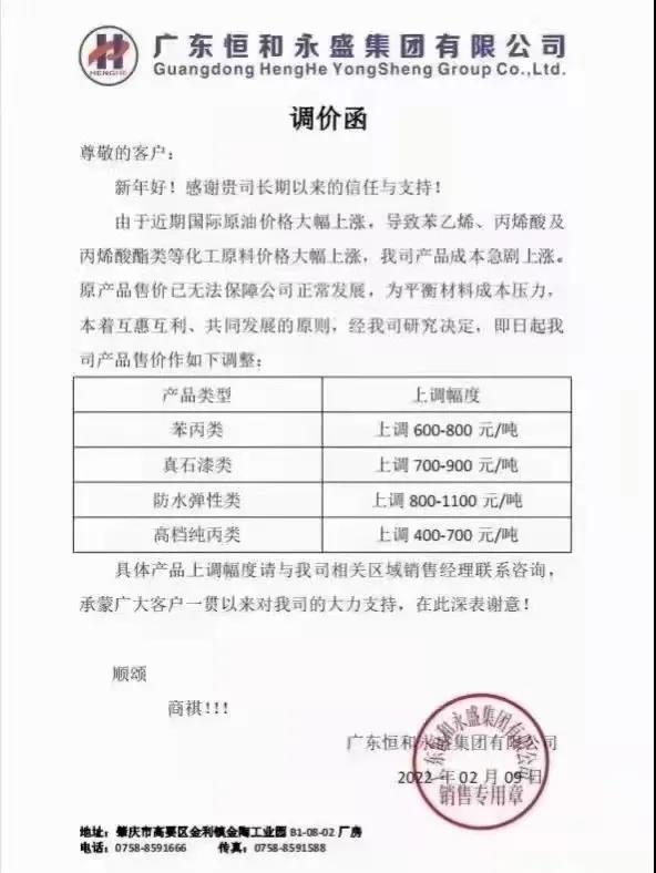 恒和永盛表示,由于近期国际原油价格大幅上涨,导致苯乙烯、丙烯酸及丙烯酸酯类等化工原料价格大幅上涨,我司产品成本急剧上涨。原产品售价已无法保障公司正常发展,为平衡材料成本压力,本着互惠互利、共同发展的原则,经我司研究决定,即日起我司产品售价作如下调整:苯丙类上调 600-800元/吨;真石漆类上调700-900元/吨;防水弹性类上调 800-1100元/吨;高档纯丙类上调400-700元/吨。
