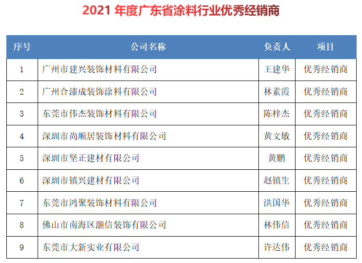 19名经销商获得“2021年度广东省涂料行业卓越经销商”称号;9名荣揽“2021年度广东省涂料行业诚信经销商”称号;11名获得“2021年度广东省涂料行业诚信经销商”荣誉称号。