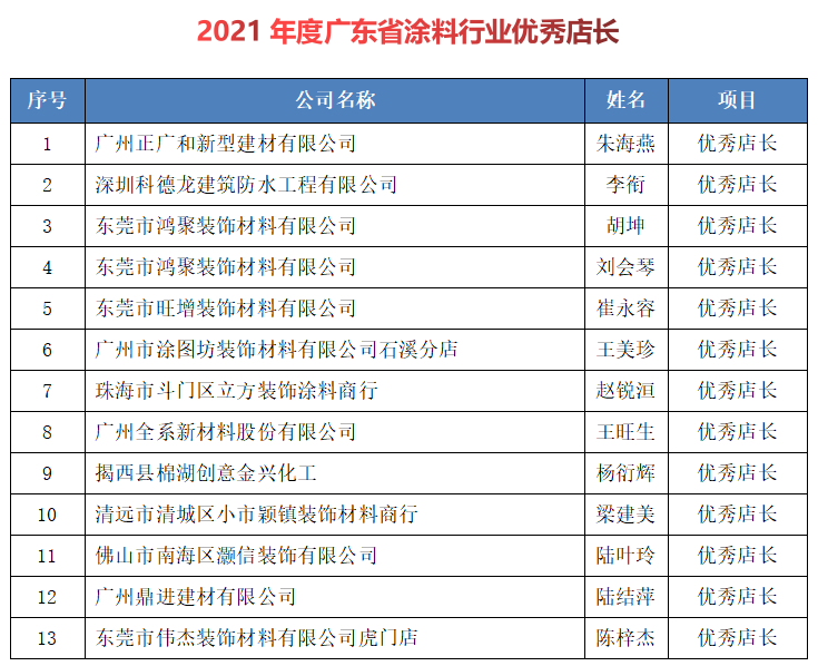 此外有12家门店接受“2021年度广东省涂料行业优秀门店”荣誉表彰;13名人员获得“2021年度广东省涂料行业优秀店长”光荣称号。表彰名单如下: