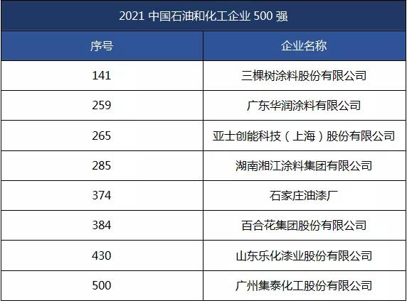 榜单显示,有8家涂料企业上榜2021中国石油和化工企业500强,分别是:三棵树涂料股份有限公司、广东华润涂料有限公司、亚士创能科技(上海)股份有限公司、湖南湘江涂料集团有限公司、石家庄油漆厂、百合花集团股份有限公司、山东乐化漆业股份有限公司、广州集泰化工股份有限公司,分列第141、259、265、285、374、384、430、500位。