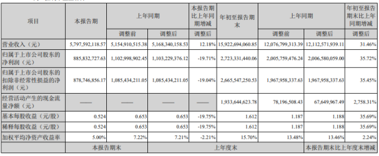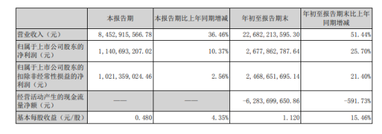 前三季度实现营收约为226.82亿元,同比增长51.44%;实现归属于上市公司股东的净利润约为26.78亿元,同比增长25.70%。