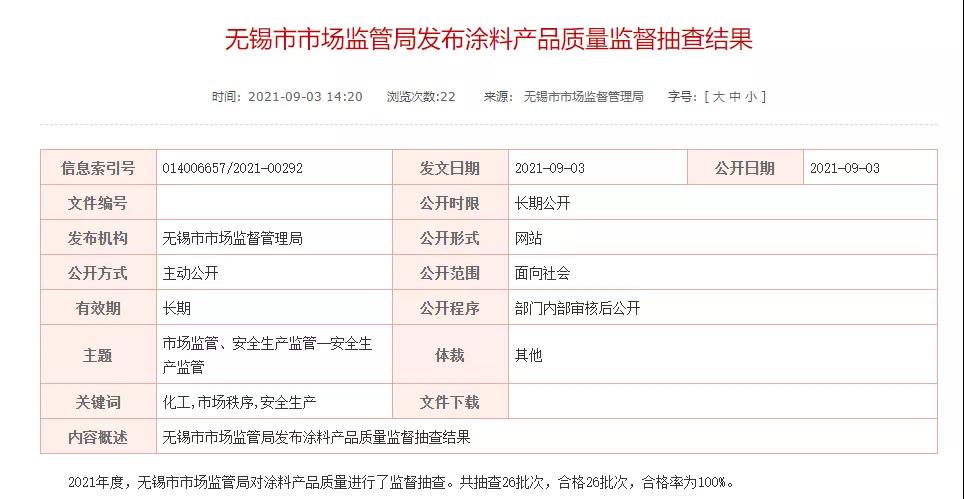 近日,江苏无锡市市场监管局发布涂料产品质量监督抽查结果。2021年度,无锡市市场监管局对涂料产品质量进行了监督抽查。共抽查26批次,合格26批次,合格率为100%。