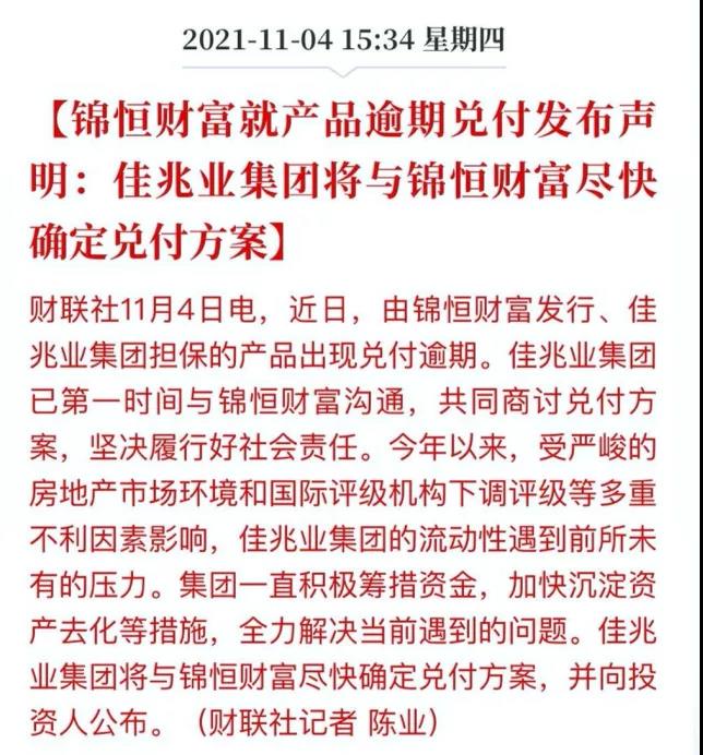 对于锦恒财富产品逾期兑付的情况,佳兆业回应称,今年以来,受严峻的房地产市场环境和国际评级机构下调评级等多重不利因素影响,佳兆业集团的流动性遇到前所未有的压力。