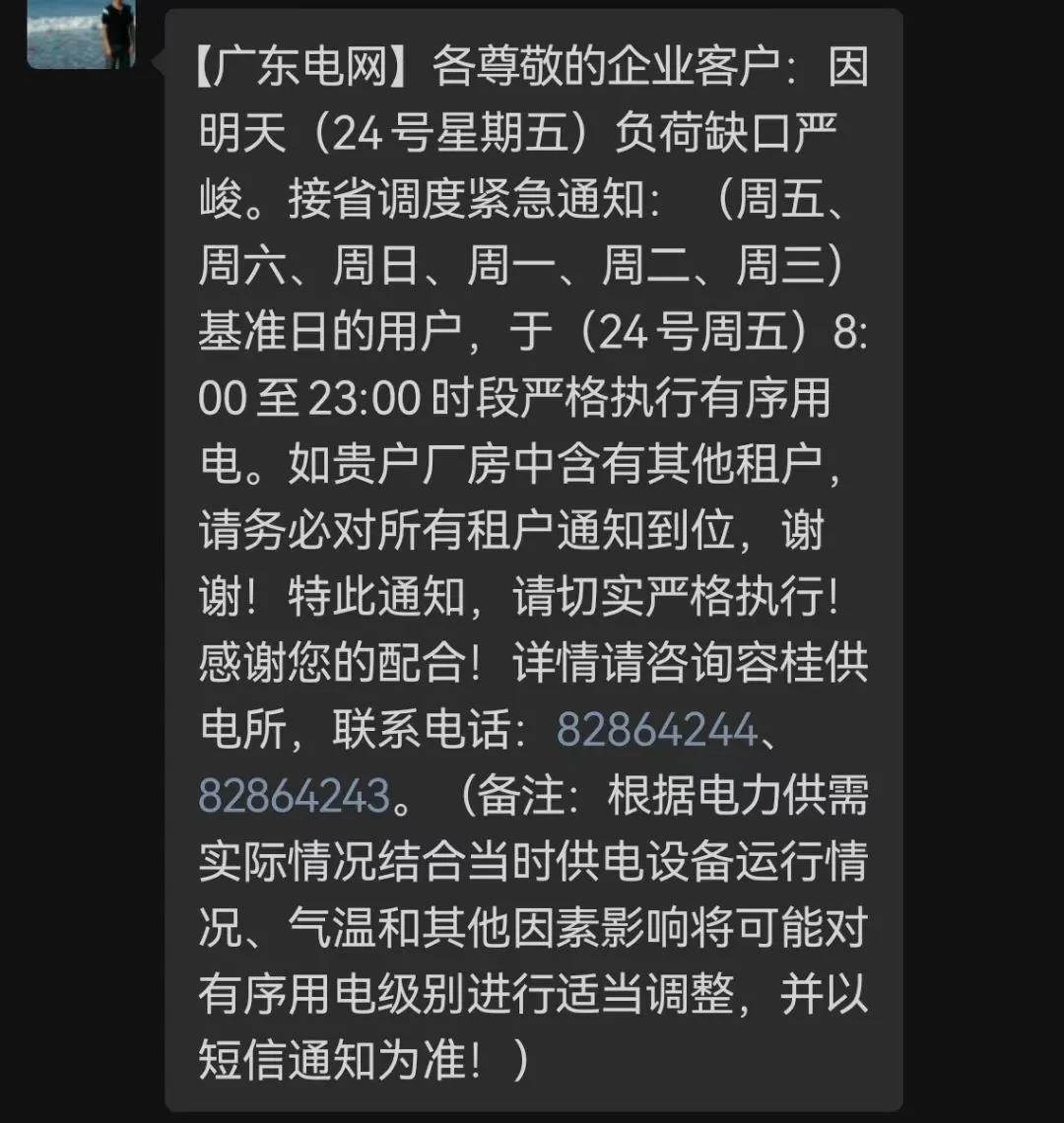 与此同时,广东地区广州、佛山、东莞、惠州、中山、潮州等多个地区企业表示,已经收到通知,执行“开五停二”有序用电,高峰时段(9-12时、14-17时)停止生产用电,只保留保安、保温负荷,照明及生活用电。