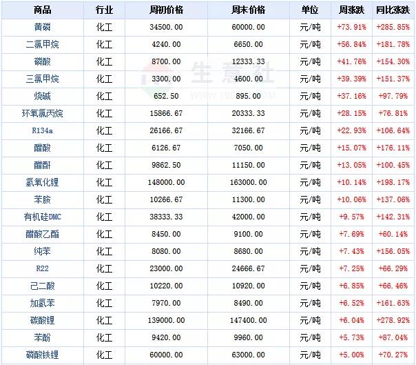 云贵黄磷价格大涨。数据显示,周初报盘34500元/吨,周末已涨至60000元/吨,周内涨幅73.91%,同比涨幅285.85%。