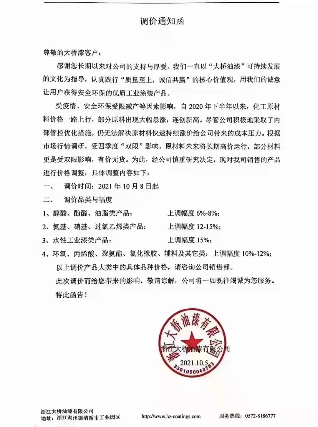 面对原材料的疯狂涨价,涂企也连发“地震”,层层传导。最先是工程涂料架不住对原材料的大量需求涨价、紧接着装饰漆零售、家具漆等民用涂料也加入涨价行列,渐渐的工业涂料、功能涂料等无一幸免。这就导致了涂料行业整体的涨价趋势如同洪水猛兽,势不可挡。