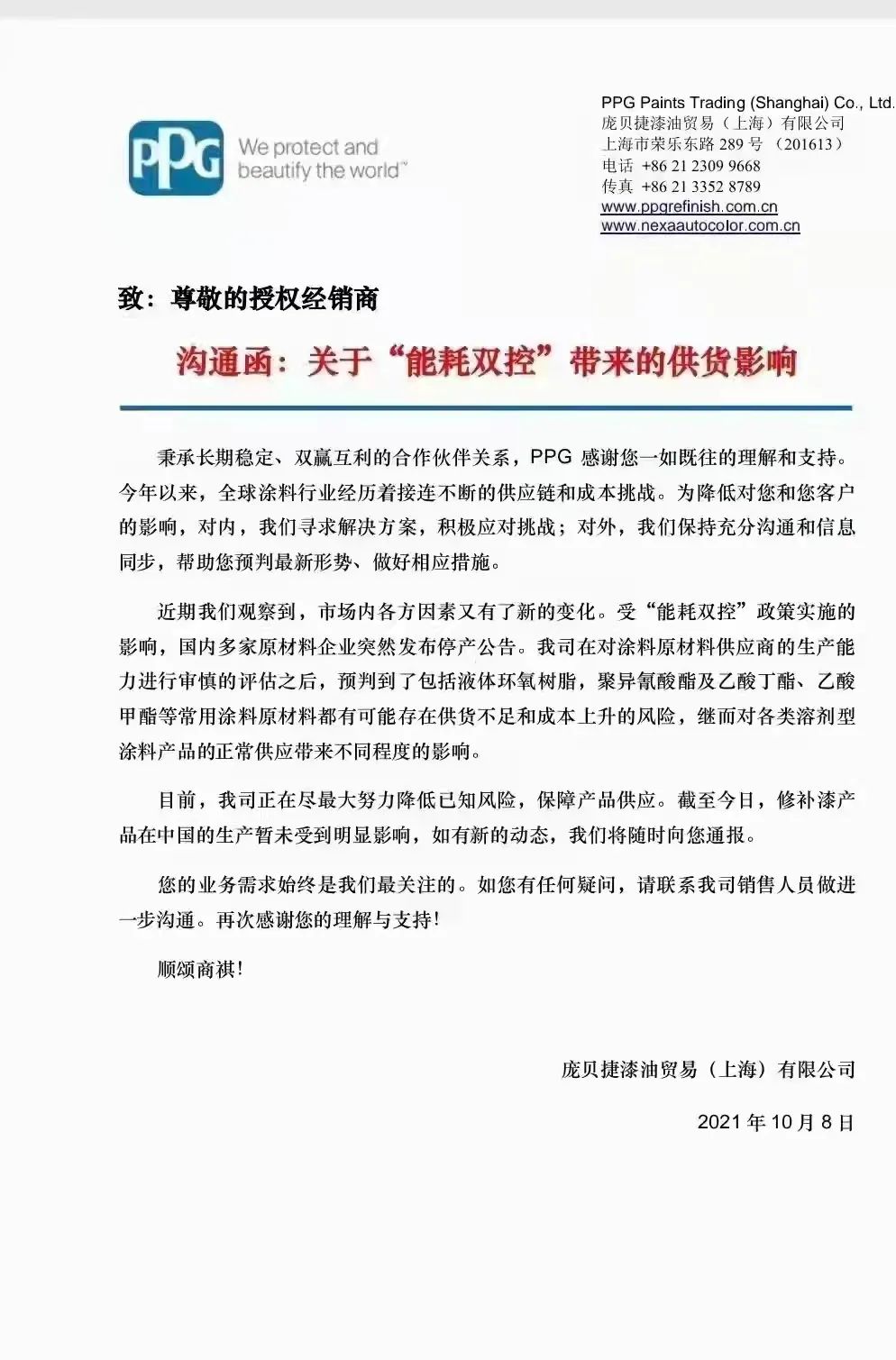 在10月8日,PPG发布的《沟通函:关于“能耗双控”带来的供货影响》中明确提到:“受'能耗双控'政策实施的影响,国内多家原材料企业突然发布停产公告。我司在对涂料原材料供应商的生产能力进行审慎的评估之后,预判到了包括液体环氧树脂,聚异氰酸酯及乙酸丁酯、乙酸甲酯等常用涂料原材料都有可能存在供货不足和成本上升的风险,继而对各类溶剂型涂料产品的正常供应带来不同程度的影响。”