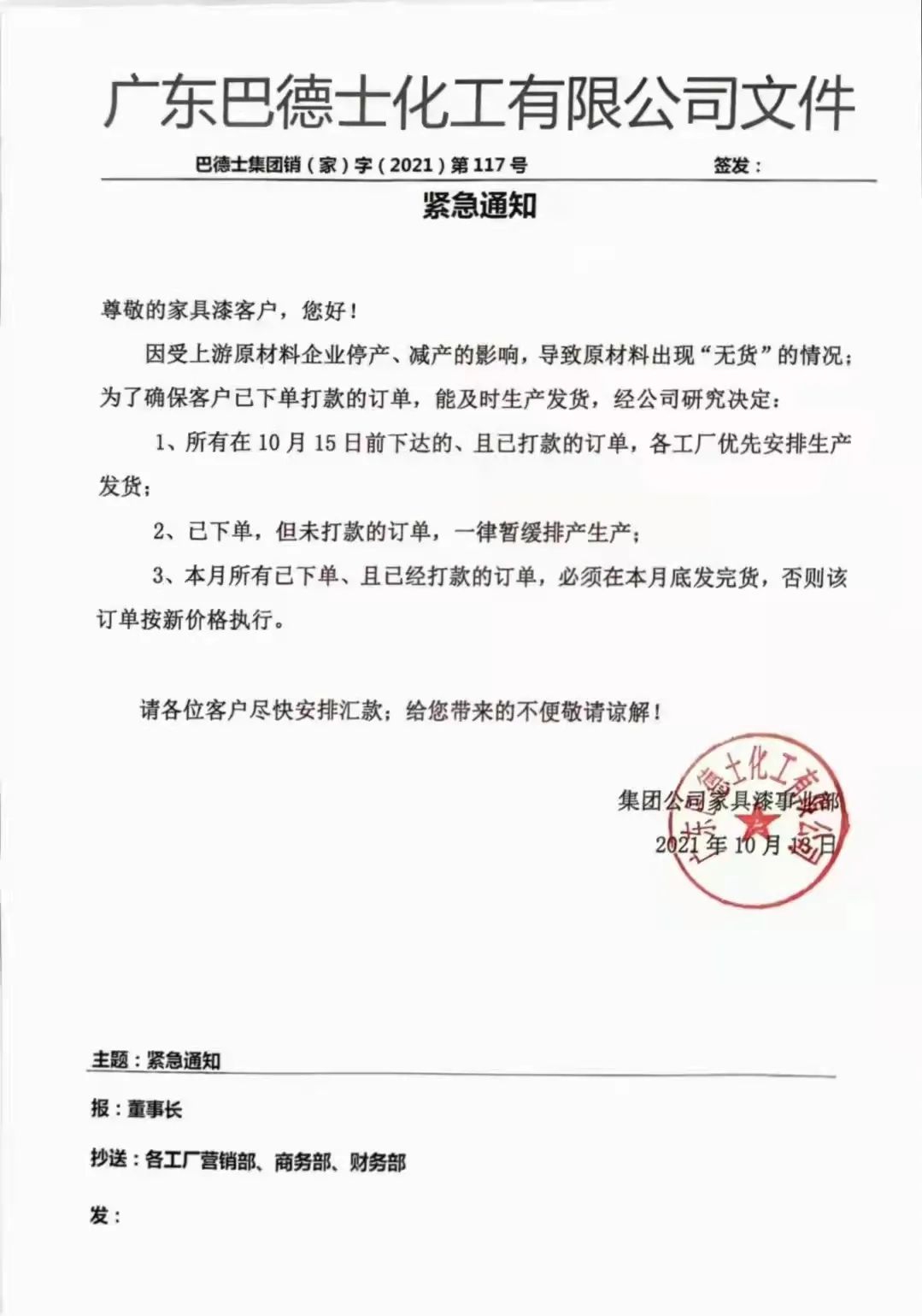 广东巴德士化工有限公司也于10月13日发布紧急通知——