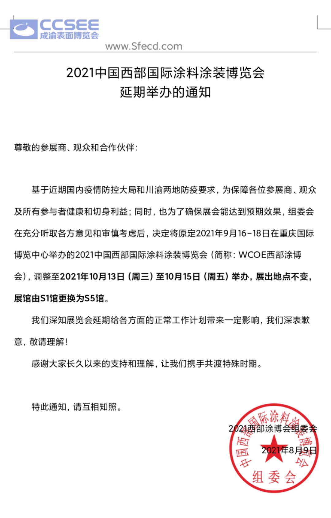 基于近期国内疫情防控大局和川渝两地防疫要求,为保障各位参展商、观众及所有参与者健康和切身利益;同时,也为了确保展会能达到预期效果,2021西部涂博会组委会在充分听取各方意见和审慎考虑后,决定将原定2021年9月16-18日在重庆国际博览中心举办的2021中国西部国际涂料涂装博览会(简称:WCOE西部涂博会),调整至2021年10月13日(周三)至10月15日(周五)举办,展出地点不变,展馆由S1馆更换为S5馆。