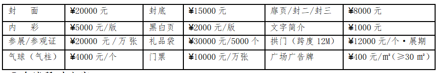 1、金牌赞助商:58000RMB/家(独家);银牌赞助商:30000RMB/家(仅限2家);在展会邀请函、大会开幕式/论坛背景板、门票/请柬等对外宣传推广;