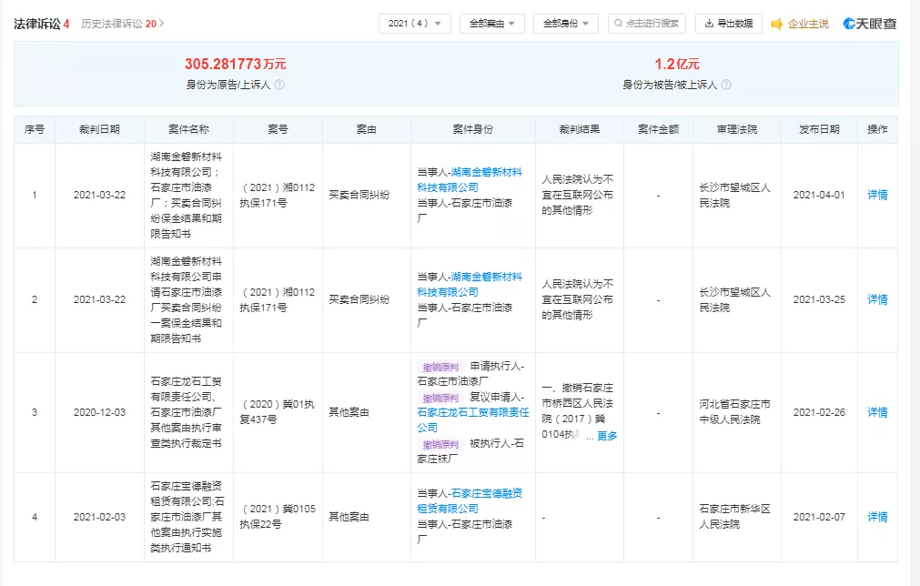 天眼查显示,石家庄油漆厂身为被告人的诉讼金额达到1.2亿元