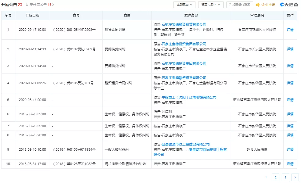 根据开庭公告显示,石家庄油漆厂作为被告人的情况多发生在去年,因此可推测石家庄油漆厂已于去年或者更早的时刻已经资金链出现问题,目前究竟情况如何,暂且未知。