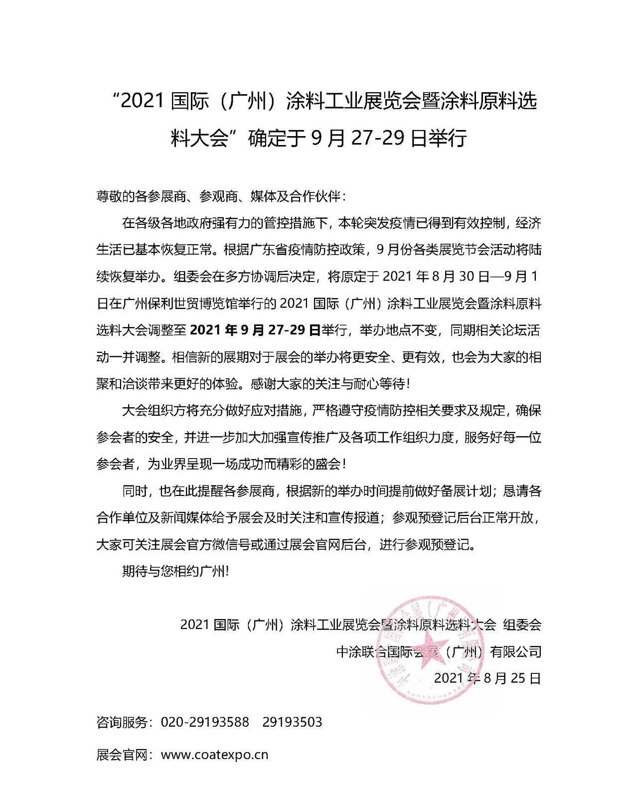 在各级各地政府强有力的管控措施下,本轮突发疫情已得到有效控制,经济生活已基本恢复正常。根据广东省疫情防控政策,9月份各类展览节会活动将陆续恢复举办。组委会在多方协调后决定,将原定于2021年8月30日—9月1日在广州保利世贸博览馆举行的2021国际(广州)涂料工业展览会暨涂料原料选料大会调整至2021年9月27-29日举行,举办地点不变,同期相关论坛活动一并调整。相信新的展期对于展会的举办将更安全、更有效,也会为大家的相聚和洽谈带来更好的体验。感谢大家的关注与耐心等待!