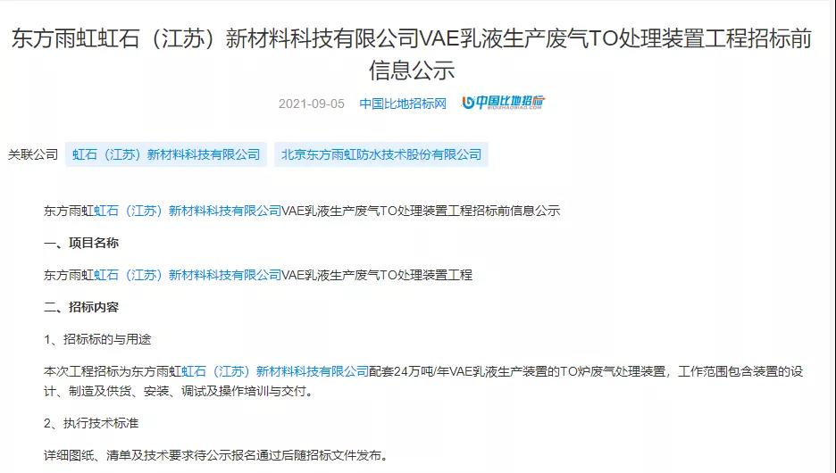 《涂料经》记者注意到:9月5日,东方雨虹虹石(江苏)新材料科技有限公司在中国比地招标网上发布《VAE乳液生产废气TO处理装置工程招标前信息公示》,为东方雨虹虹石(江苏)新材料科技有限公司招标配套24万吨/年VAE乳液生产装置的TO炉废气处理装置,工作范围包含装置的设计、制造及供货、安装、调试及操作培训与交付,报名截止时间为2021年9月8日(今日)17时0分。