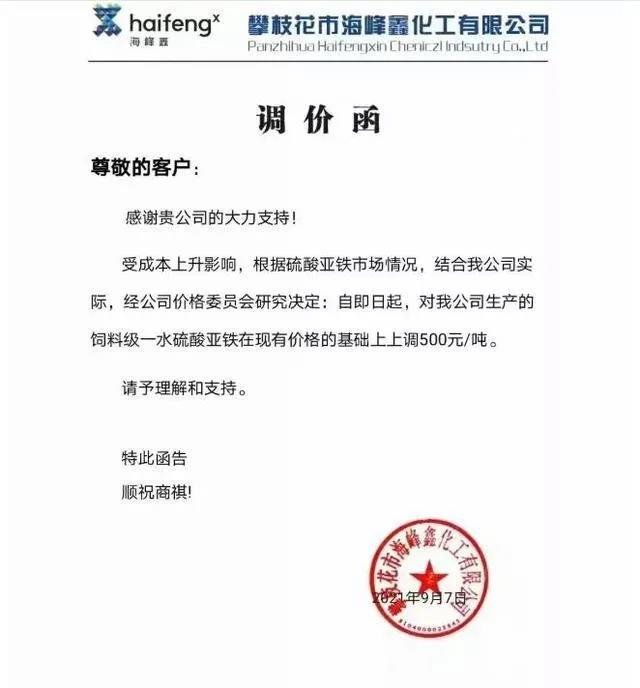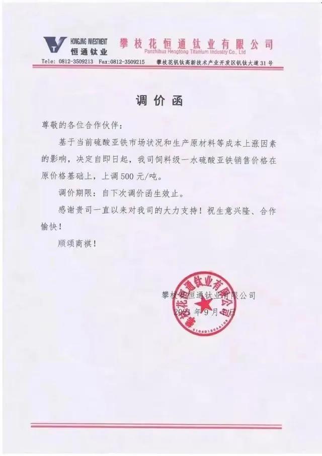 9月7日,攀枝花恒通钛业有限公司发调价函称:基于当前硫酸亚铁市场状况和生产原材料等成本上涨因素的影响,决定自即日起,我司饲料级一水硫酸亚铁销售价格在原价格基础上,上调500元/吨。调价期限:自下次调价函生效止。
