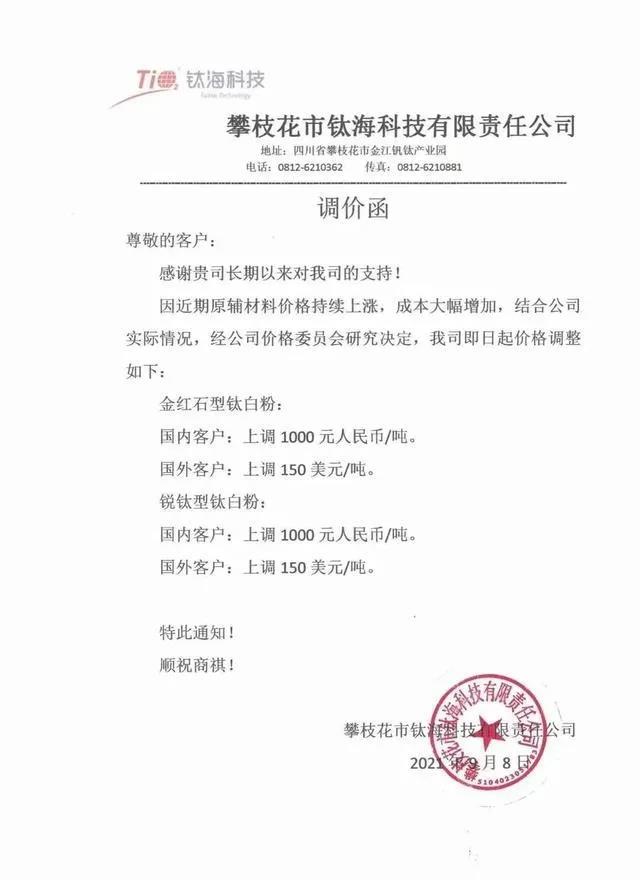 9月8日,攀枝花市钛海科技有限公司发调价函称:因近期原辅材料价格持续上涨,成本大幅增加,结合公司实际情况,经公司价格委员会研究决定,我司即日起价格调整如下:金红石型钛白粉国内客户上调1000元人民币/吨,国外客户上调150美元/吨;锐钛型钛白粉国内客户上调1000元人民币/吨,国外客户上调150美元/吨。