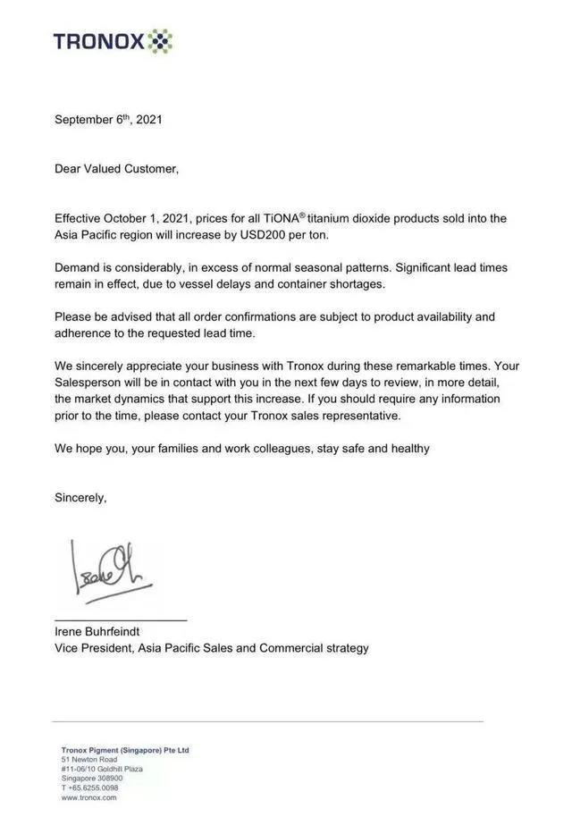 而在此前,钛白粉巨头特诺发函,称10月1日起,特诺钛白粉销往亚太地区的产品将涨价200美元/吨(约合人民币1291元/吨)。