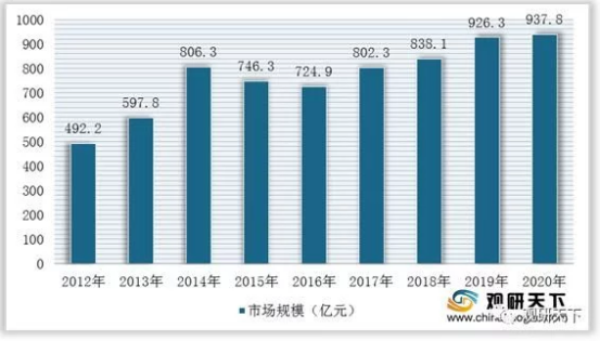 根据数据显示,我国重防腐涂料市场规模从2012年的492.18亿元增长至2020年的937.8亿元,2012年以来我国重防腐涂料市场规模复合增长率为8.39%。截止2020年,中国重防腐涂料产量估计为409.7万吨,同比增长2.66%,市场规模达到937.8亿元(约144.76亿美元)。按照重防腐涂料占整个防腐涂料行业七成计算,我国的防腐涂料市场规模大约1340亿元(约206.84亿美元)。