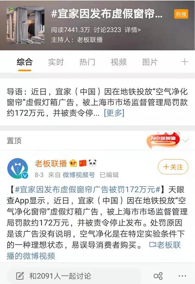 最近,宜家(中国)投资有限公司收到了上海市场监督管理局172万余元的罚单,原因是违反广告法相关条例,发布虚假广告:宣传窗帘产品可以净化空气。