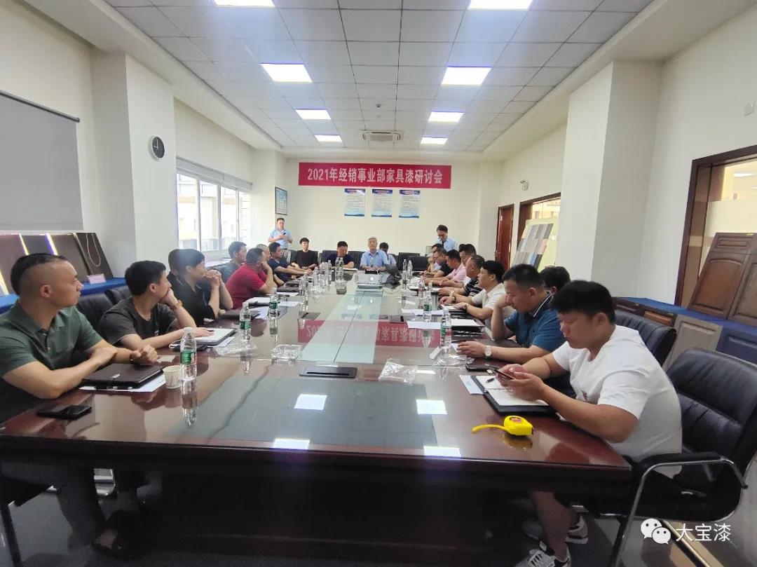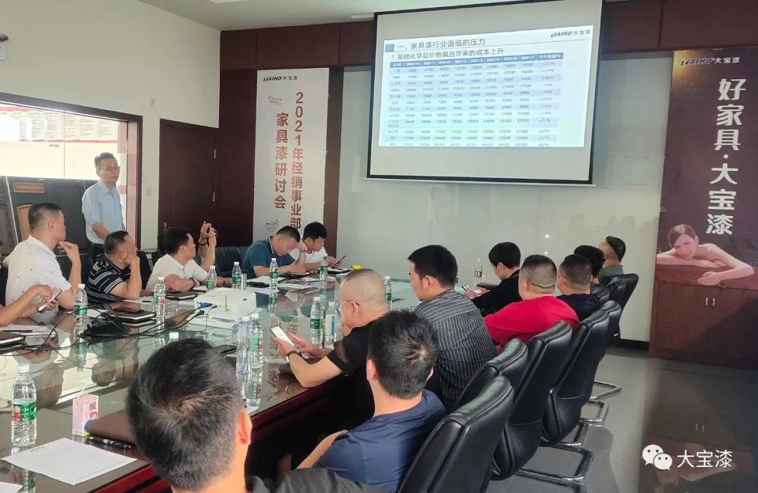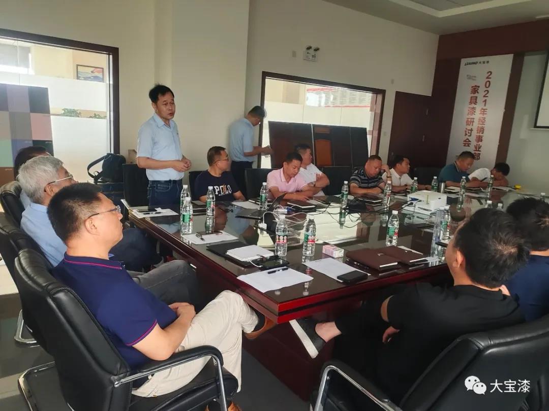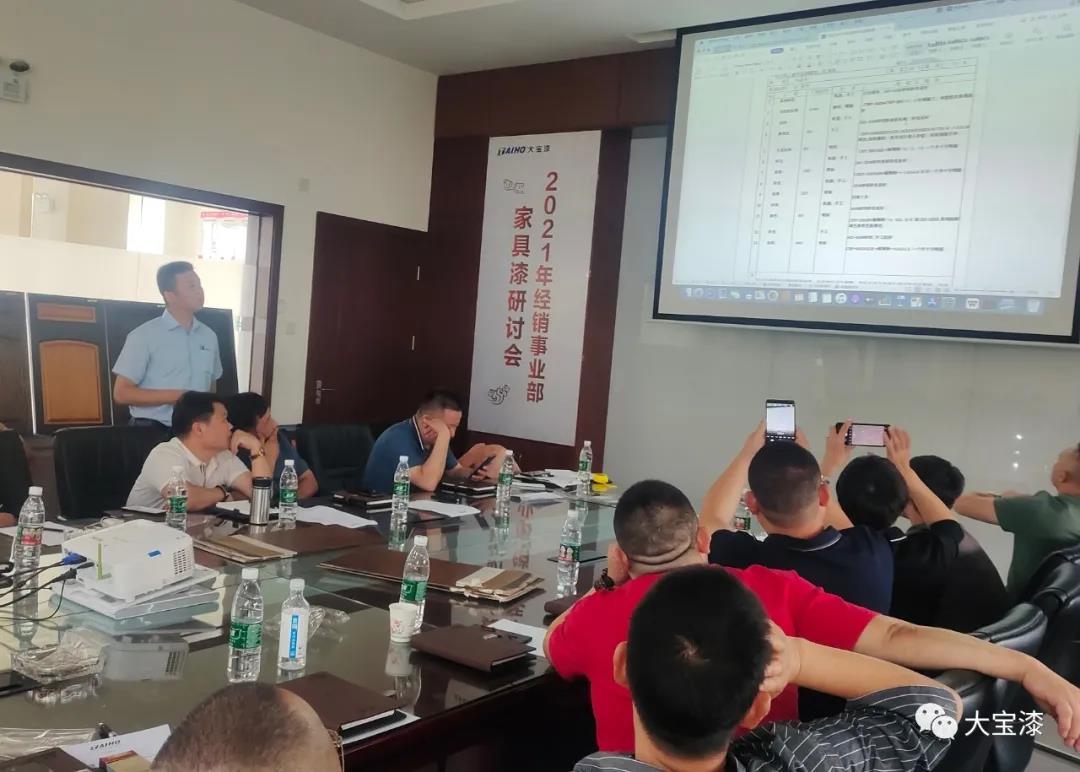 大宝化工经销事业部家具漆研讨会中,经销事业部家具漆执行经理刘国勇以“破局 共生”为主题作了工作报告,刘国梁从国际环境到国内环境到市场环境现状进行了深入的分析,从公司在国内市场布局、2021年上半年业绩达成情况分析、客户定位、产品品项突破、特色化产品、市场流通型产品、服务支持等方面进行了全面的讲解,通过“破局 共生”两部分希望公司与经销商一起并肩作战,共迎困难。