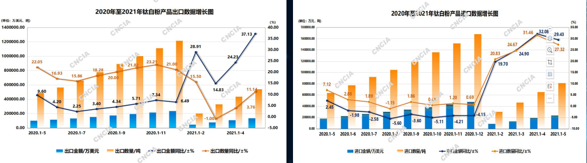 原材料方面,据刘杰介绍,据海关总署统计,2020年5月至2021年5月期间,钛白粉出口增速平稳,出口金额增速明显高于出口量增速,说明国内国际钛白粉市场价格增长较快,需求依然较为旺盛。