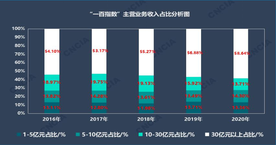 “一百指数”企业方面,2016年至2020年期间,主营业务收入高于30亿元的企业其主营业务收入占全行业的比例由54.1%上涨至58.64%;主营业务收入在10亿~30亿元的企业在全行业的占比由2016年的18.97%降低至2020年的13.71%。