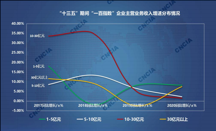 “十三五”期间“一百指数”企业主营业务收入增速分布情况