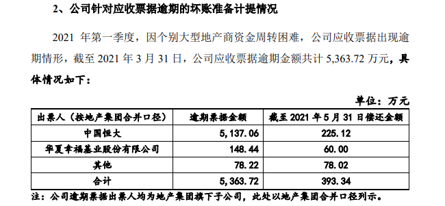 6月29日,三棵树(603737)发布《关于三棵树涂料股份有限公司2021年度非公开发行股票申请文件反馈意见的回复报告(修订稿)》,报告指出,2021年第一季度,因个别大型地产商资金周转困难,三棵树公司应收票据出现逾期情形,截至2021年3月31日,三棵树公司应收票据逾期金额共计5363.72万元。其中中国恒大逾期票据金额5137.06万元,占总应收票据逾期金额的95.77%。