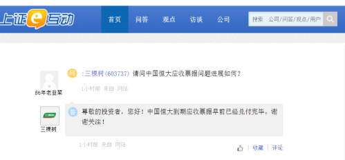 关于恒大欠三棵树的钱给了吗?三棵树官方做出了回应:6月29日晚间,三棵树副总裁兼财务总监朱奇峰接受界面新闻记者采访时表示,中国恒大到期应收票据早前已经兑付完毕。6月30日,在投资者关于“中国恒大应收票据问题进展如何”的提问中,三棵树回复称:中国恒大到期应收票据早前已经兑付完毕。