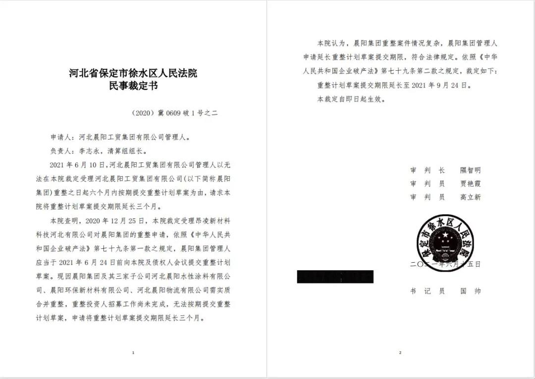 《涂料经》记者近日从全国企业破产重整案件信息网了解到,因无法在6个月内按期提交重整计划草案,河北晨阳工贸集团有限公司(简称晨阳集团)管理人向河北省保定市徐水区人民法院(下称徐水法院)申请延期提交重整计划草案,提交期限延长3个月。徐水法院依法裁定该申请。