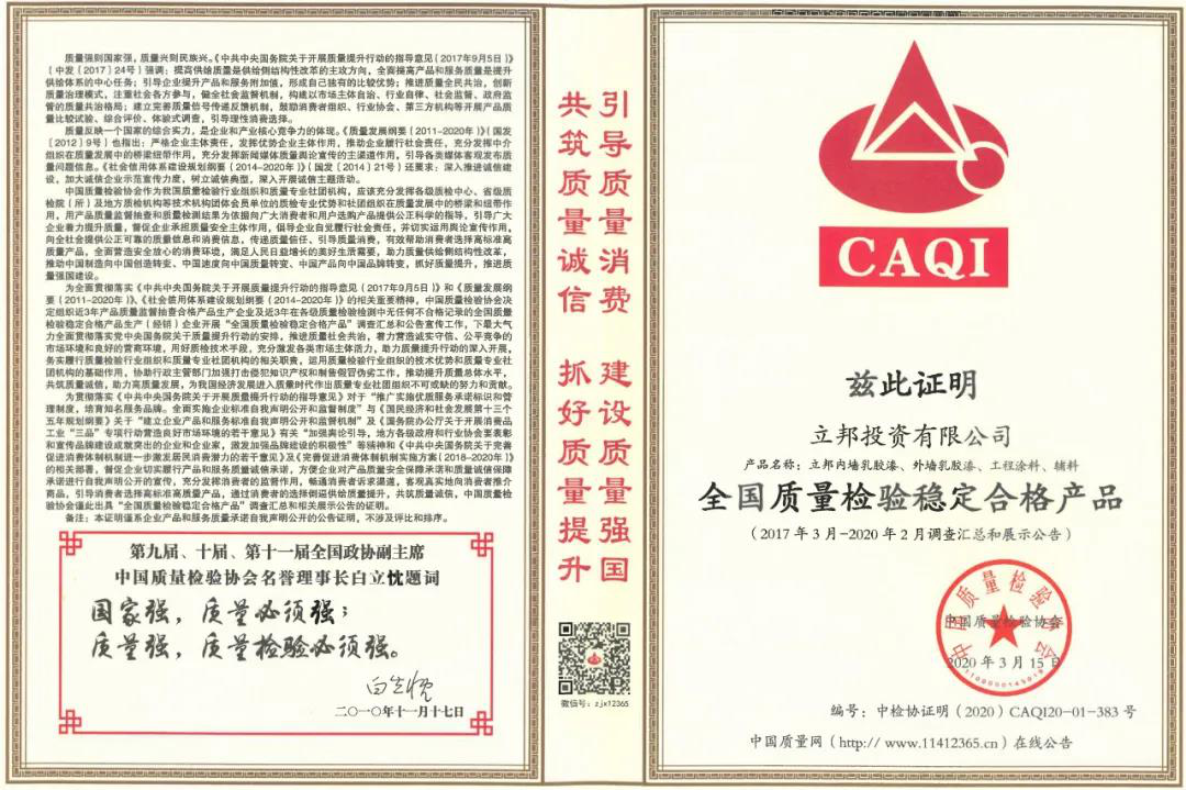 立邦获得的“全国质量检验稳定合格产品”荣誉证书样式