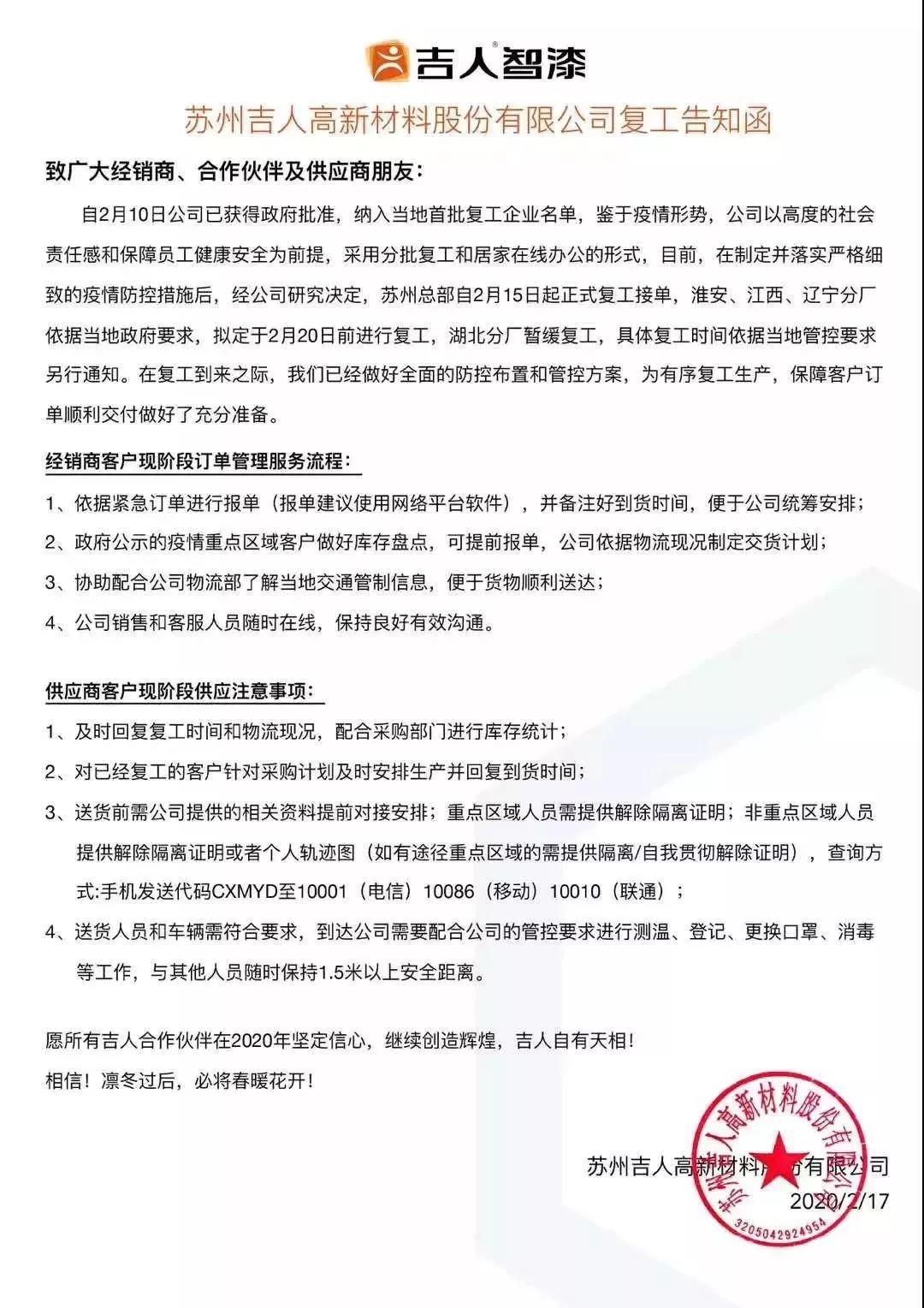 日前,吉人高新发布公告,苏州总部自2月15日起正式复工接单。淮安、江西、辽宁分厂依据当地政府要求拟定于2月20日前进行复工,湖北分厂暂缓复工,具体复工时间依据当地管控要求另行通知。